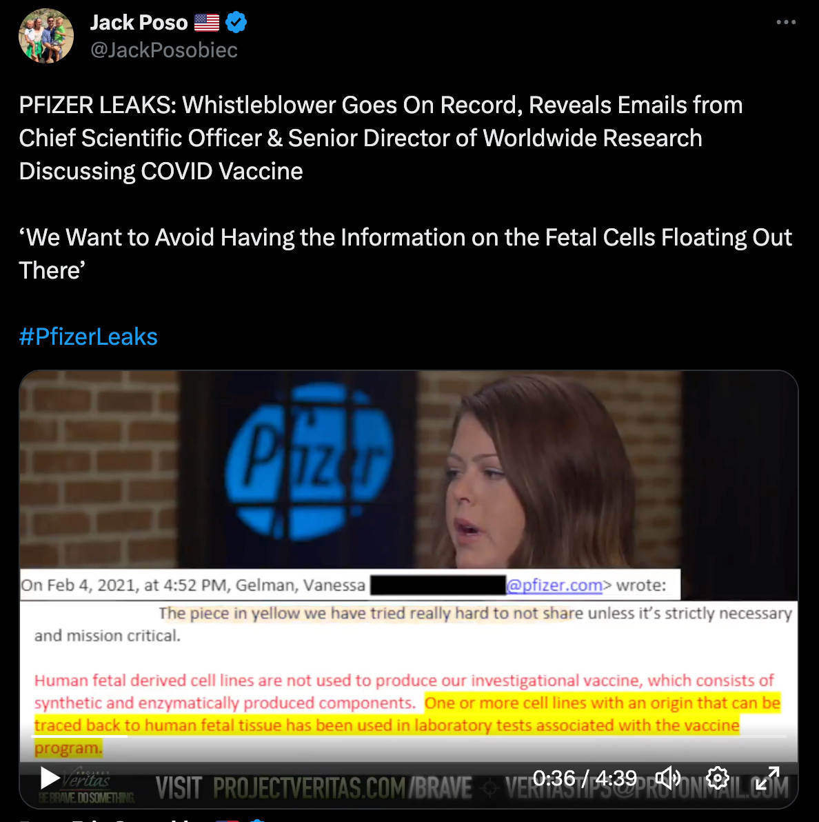 在前两年宗教豁免大战强制疫苗的时候,如果你告诉“科学教”信众,说新冠疫苗是用堕胎胚胎开发的,他们会反驳说辉瑞和摩德纳的mRNA疫苗成分里没有胚胎。但是他们不自知,或者不愿告诉你的是,虽然mRNA疫苗成品里没有胚胎,但是测试疫苗所用的细胞系却是来自堕胎的活体婴儿。辉瑞员工曾向Project Veritas爆料公司高层的邮件,显示高层试图向公众隐藏使用胚胎开发疫苗的事实。
