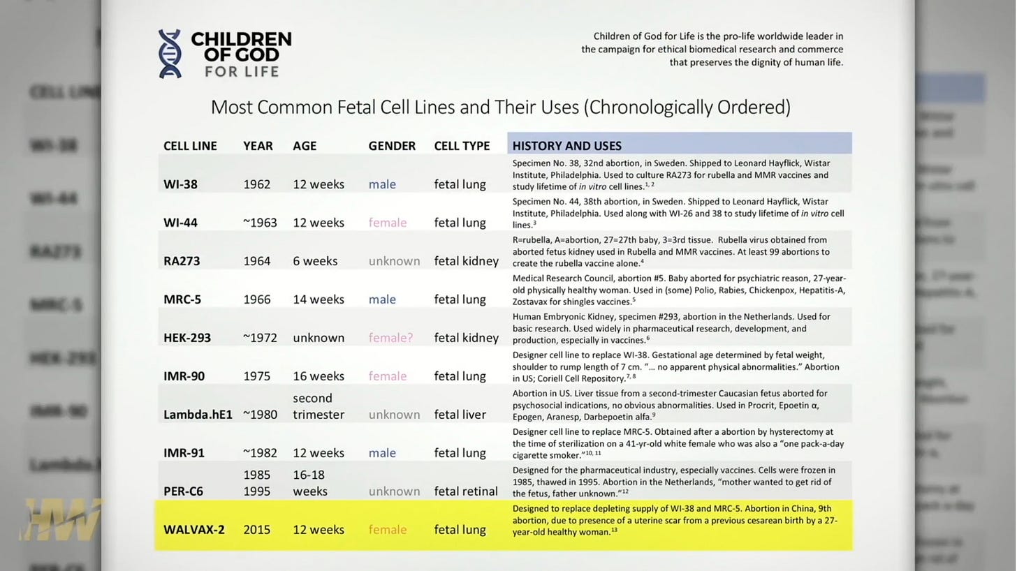 下图是支持生命的机构揭露的用于疫苗开发的常用细胞系简介。反对意见会说用胚胎做细胞系是60、70年代的事情,现在已经不用了。但是事实上,药商至今都在取用胚胎,比如列表最后一条WALVAX-2是2015年培养的细胞系,用以取代之前受到污染的细胞系。