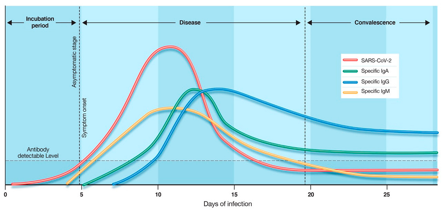 先来说一下Covid自然免疫过程中,这些抗体是如何工作的。在症状出现后不久,身体开始制造IgM和IgA。当IgM和IgA达到峰值时,患者开始康复,IgM和IgA逐渐消失,同时身体开始产生 IgG,然后IgG停留在血液中,提供对病毒的长期免疫力。IgA就像海军陆战队,高效击退敌军。IgG更像是装备精良的地方警察,留在领地维持和平。