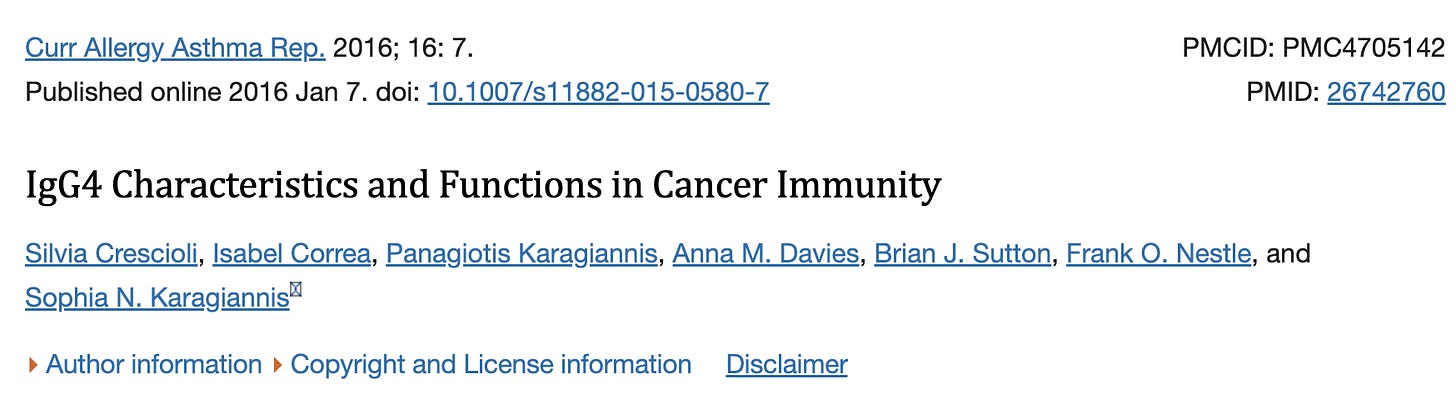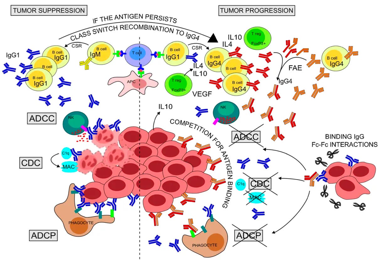 所以问题就变成了,在癌症的背景下的IgG类别转换会有什么结果,特别是当抗体亚类比例因长期暴露于抗原而发生变化时? 或者更准确地说,当 IgG1:IgG4 亚类抗体比率在肿瘤抑制的情况下反转时会发生什么?