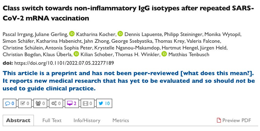 发表在2022年12月《科学》杂志子刊《免疫学》上的研究(下图)震惊了免疫学届。研究发现mRNA针剂导致IgG抗体类别向非炎症类别转换,也就是说mRNA针剂产生了错误的抗体。
