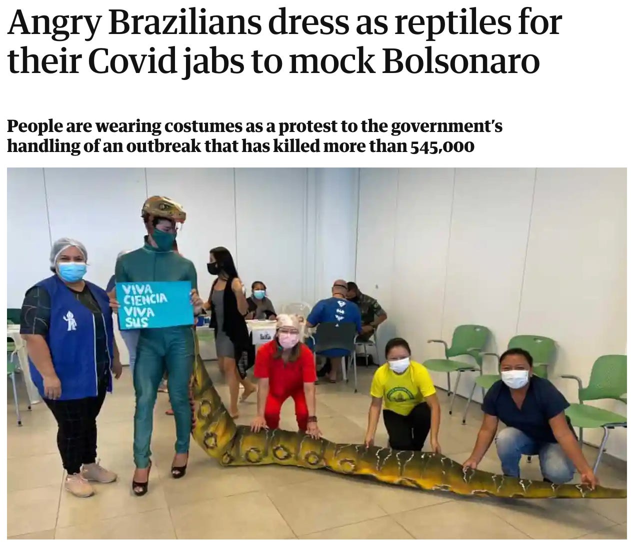 博索纳罗政府对辉瑞的霸王条款表示不满,认为这是对主权国家的蔑视。博索纳罗本人在接受媒体采访时说道,“辉瑞公司的合同非常明确,意思就是他们不对任何副作用负责。哪怕你打针变成了鳄鱼,那也是你自己的问题。” 没想到这么一句简单形象的话,踩到了雷,大药商/深层政府伺机发动了最擅长的人身攻击。他们开动宣传机器,断章取义地说博索纳罗说了,打疫苗会变成鳄鱼,让不明真相的群众嘲笑他无知反科学。这和他们当时炒作川普总统的“消毒水”话题的套路,如出一辙。