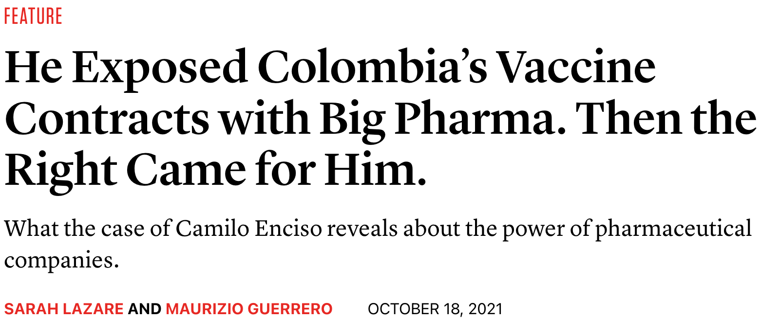 辉瑞的秘密合同还有另一个佐证。哥伦比亚反腐败研究所负责人Camilo Enciso,从司法渠道获得,并公开发布了哥伦比亚政府与阿斯利康和辉瑞公司就Covid针剂签订的机密合同。除了疫苗单价各国不同,其他内容基本与巴西政府签署的合同一致。他认为公开这份文件符合公众利益,但此举激怒了大药商,被疫情恐惧支配的人们也担忧此举会影响后续的疫苗供应。不出所料,Enciso收到了雪崩般的批评、数以千计的侮辱和对他人身安全的威胁。仅仅在公开合同的当天,他就收到了1800多条不堪入目的咒骂和恐吓短信。
