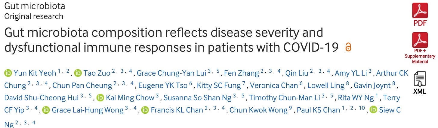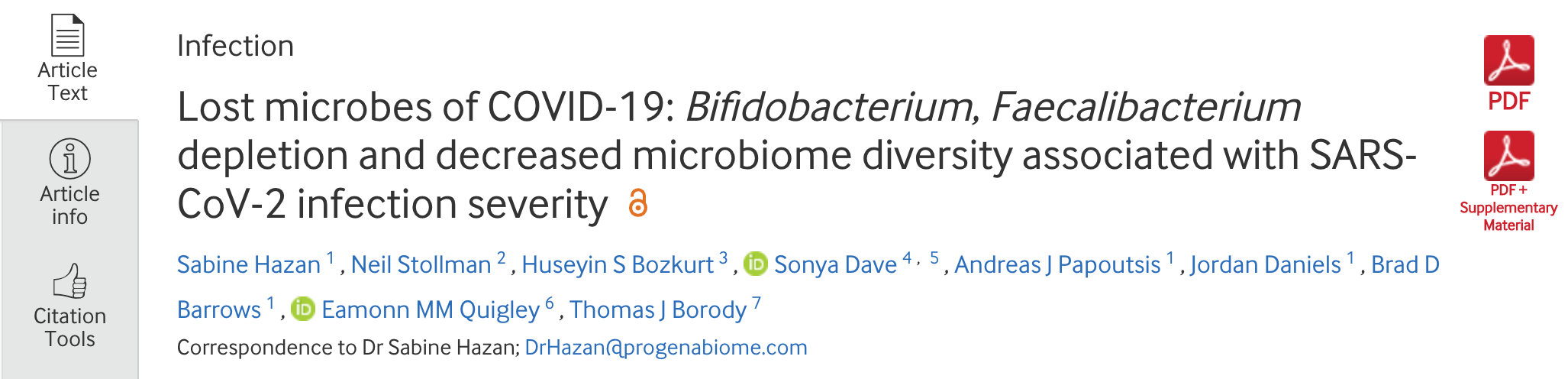 (笔者注:笔者在查询资料时,找到了Dr. Hazan团队发表的关于Covid感染后,体内益生菌耗尽的论文,和香港中文大学2021年发表的肠道菌群的组成决定了感染者症状的表现⬇️)