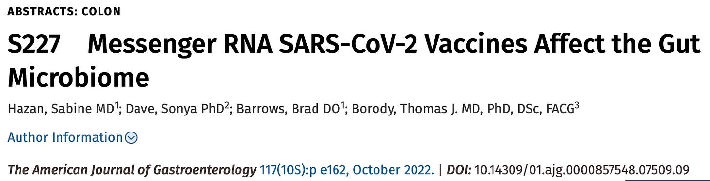 Dr. Hazan从最初的四个样本里发现,在接种一个月后,双歧杆菌这种重要的微生物在患者体内逐渐下降。这是精准医学,这是肠道法医学。同一个病人,只有特定的一组微生物被杀死。Dr. Hazan开始担忧。接着又是10、20、30 名患者,双歧杆菌都被杀死了。Dr. Hazan预料没有期刊会接受这个惊人的研究,所以将它作为演示文稿海报提交给了美国胃肠学院,最后获得了该学院的最佳研究奖。⬇️
