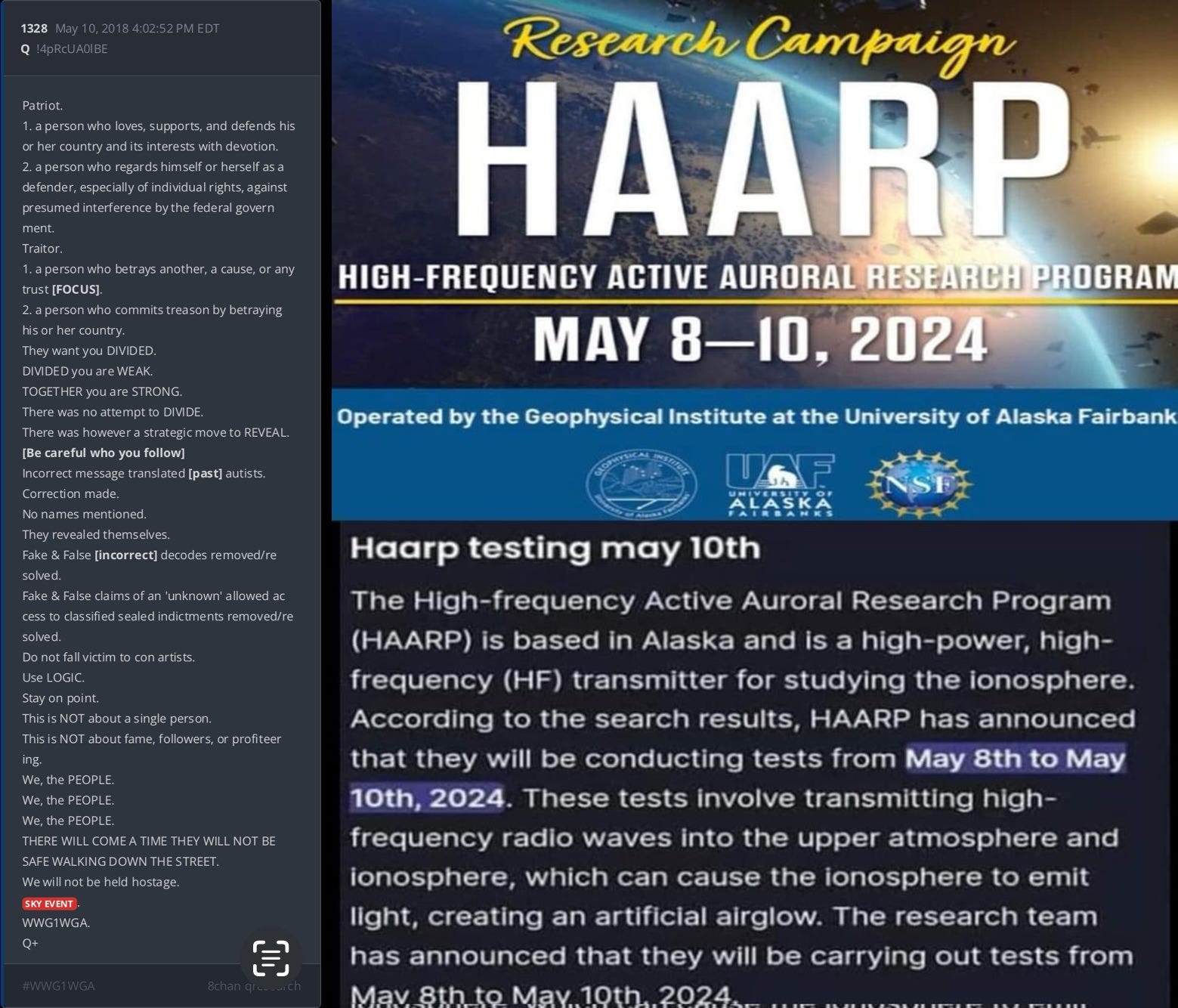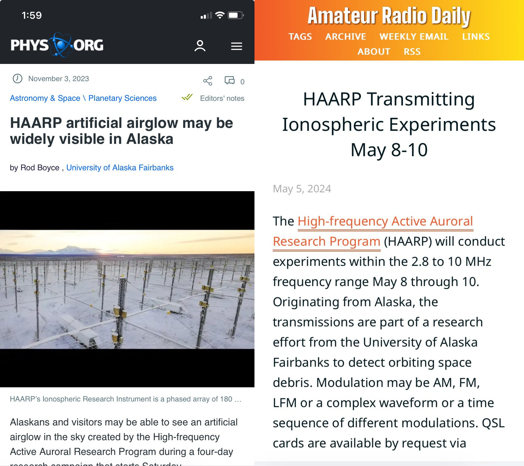 这次5月8号-10号的HAARP实验,也由费尔班克的阿拉斯加大学的HAARP实验室明确公布。只是在时间上,跟“太阳风暴”发生了“巧合”。