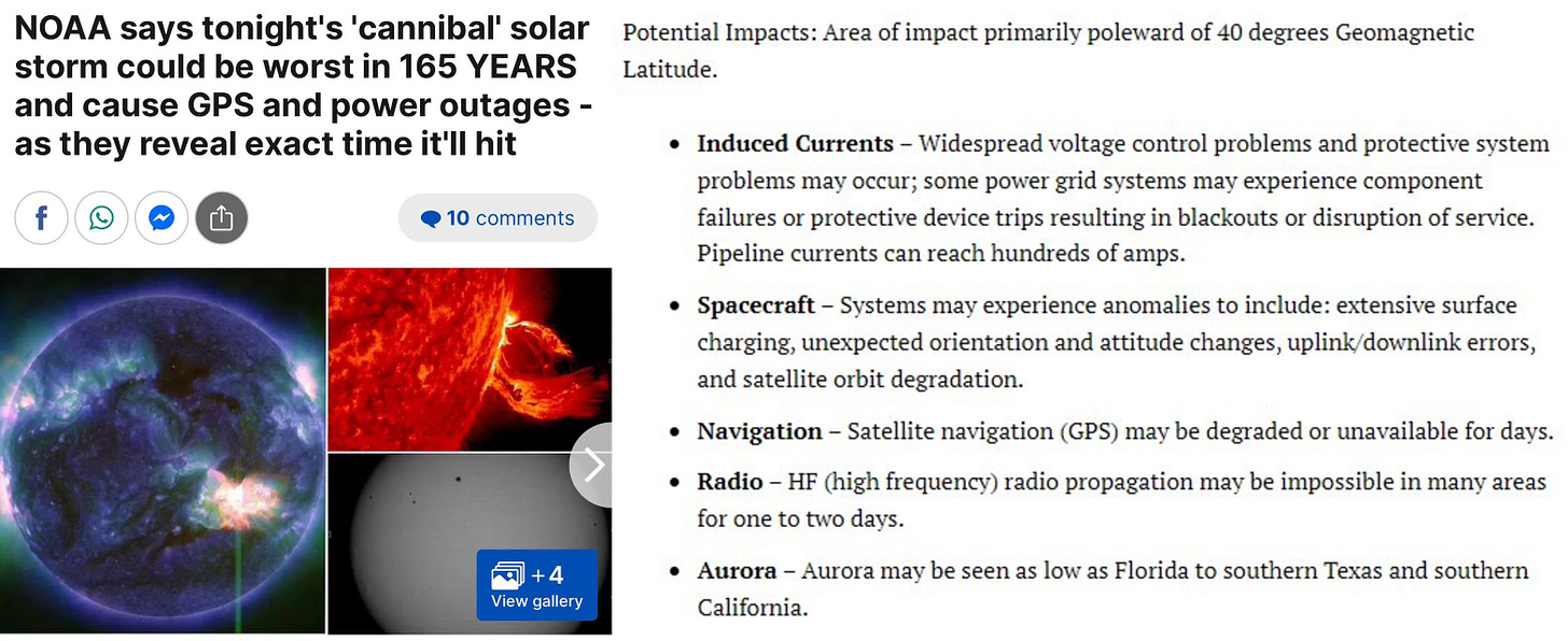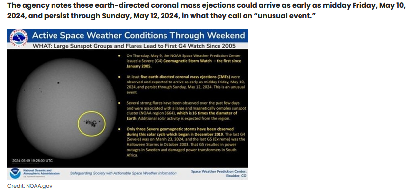 5月10号,美国海洋大气管理局(NOAA)发布了过去21年以来第一次地磁风暴警告,警告美国人太阳活动可能导致通信和 GPS 系统瘫痪,电网面临风险,并"可能出现大范围的电压控制问题"。NOAA预计风暴将于10号袭击地球,并持续到周六。起因是 "一个大太阳黑子群产生了几个中等到强烈的太阳耀斑"。华盛顿邮报(WaPo)还称:太阳风暴还可能在周五晚上引发 "异常偏南 "的北极光。