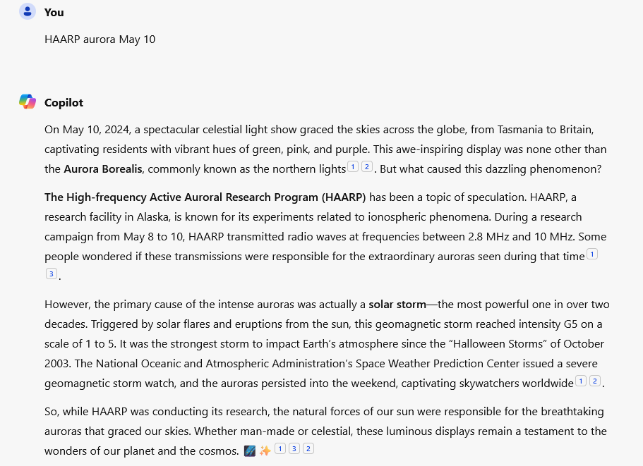 但是,笔者使用同样的搜索,“HAARP aurora May 10”,已经变成了不同的内容,更新的内容极力避开本次中低维度极光现象与HAARP有关,而是采取主流媒体和官方说法:本次极光是太阳风暴所致。当然,Malone先生最初搜索到的关于HAARP本次实验内容,也都不见了,只是笼统介绍了这个实验是与电离层现象有关。相关的AI搜索源加了两个Wikipedia。