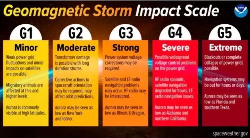 这次地磁风暴被NOAA界定为达到了G4“严重”和G5“极端”强度,G4会影响广泛的电压问题,以及破坏地球上的通讯,电网,卫星等等,极光可以从阿拉巴马和加州北部观测到;而G5的“极端”将会导致电网彻底关闭,导航系统会宕机数小时或数天,极光可能会被从佛罗里达甚至德州南部观测到。