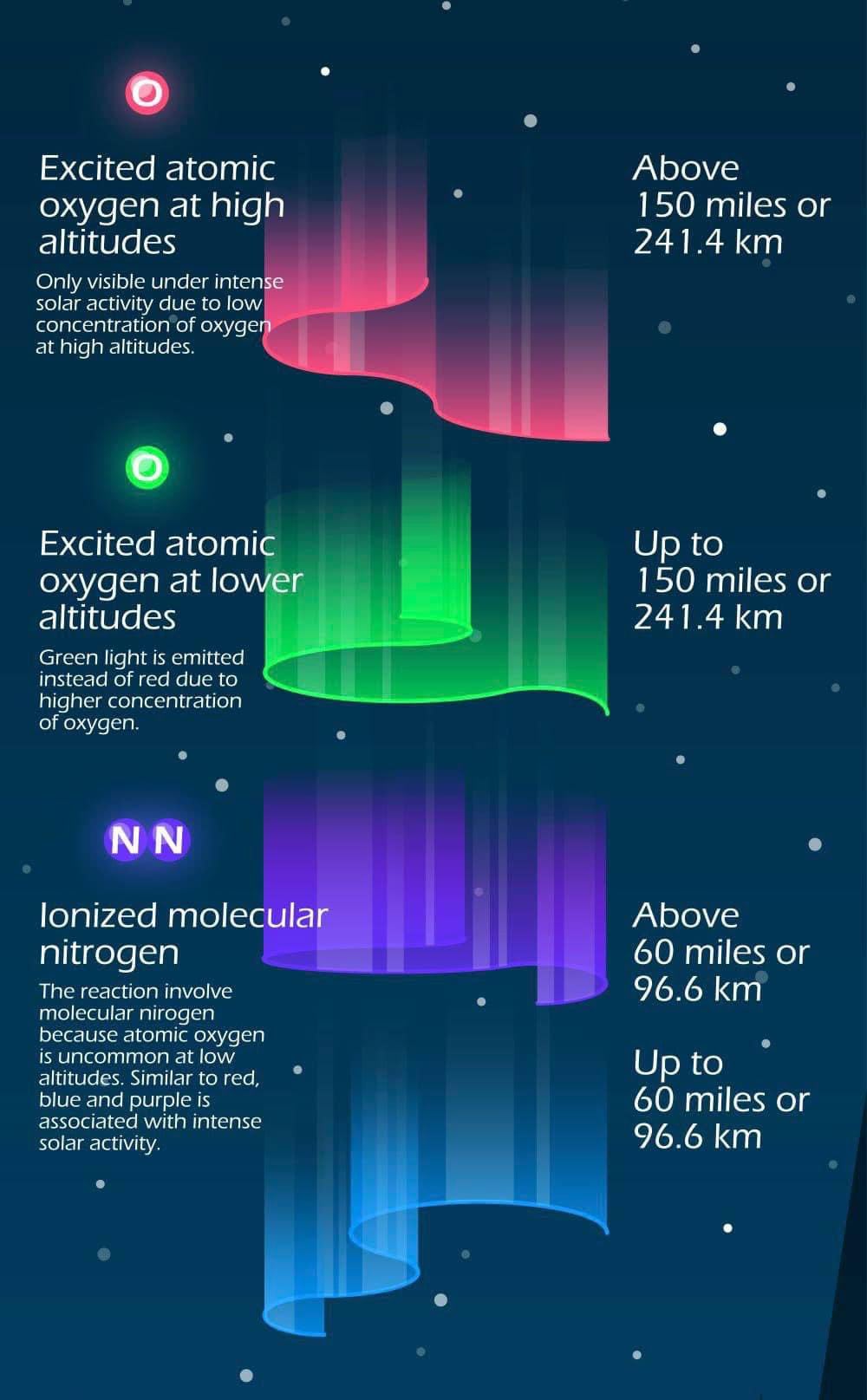 极光的颜色取决于电离子作用于拥有不同高度的高空拥有的氧原子的丰富程度。在150英里以上的高空,氧气稀薄,电离子作用于空气会产生红色光;150英里以下60英里以上,氧原子比较丰富,会产生绿色光;60英里高度,由于氮气作用,会产生紫色光;60英里一下,会产生浅蓝色光。
