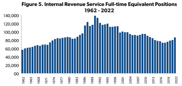 2022年第117届国会通过的《通货膨胀削减法》,包括一项提供在未来10年内向美国国税局(IRS)拨款800亿美元,招聘8万名新特工,专门针对中产阶级美国人的邪恶条款。而在2022年,IRS的工作人员已经超过8万。
